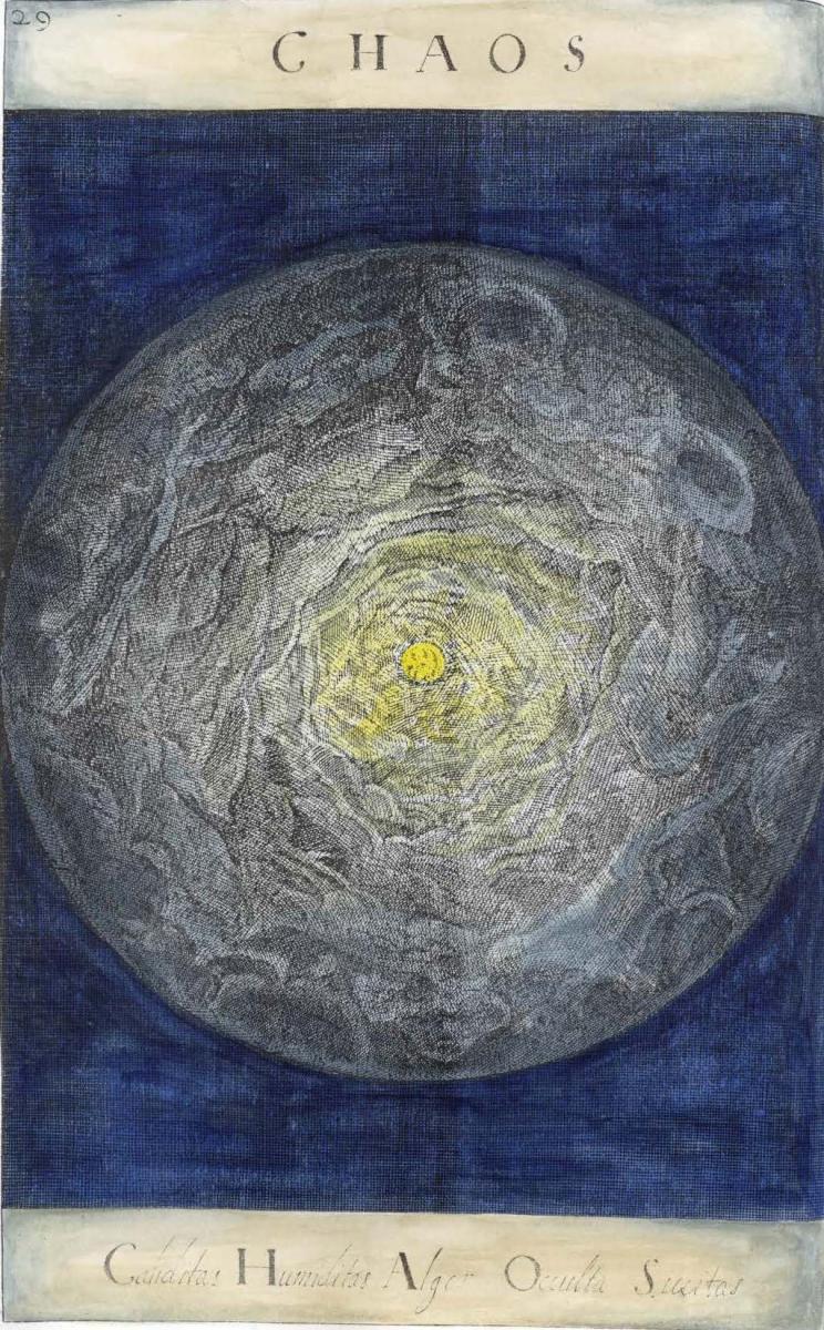 3. CHAOS. Акроним: «Жар, влага, холод, скрытая сухость». Согласно орфическим доктринам (создание которых традиционно приписывалось Орфею), Хронос (Время) был первопринципом, породившим Хаос и Эфир. Хаос, окруженный Ночью, образовал оболочку, внутри которой космическая Материя начала медленно упорядочиваться под действием Эфира. Постепенно Материя приняла форму огромного Яйца, скорлупой которого была Ночь. Внутри Яйца родилось первое существо — Фанес (Свет). Именно Фанес, Альфа и Омега алхимии, создал Небо и Землю, соединившись с Ночью.