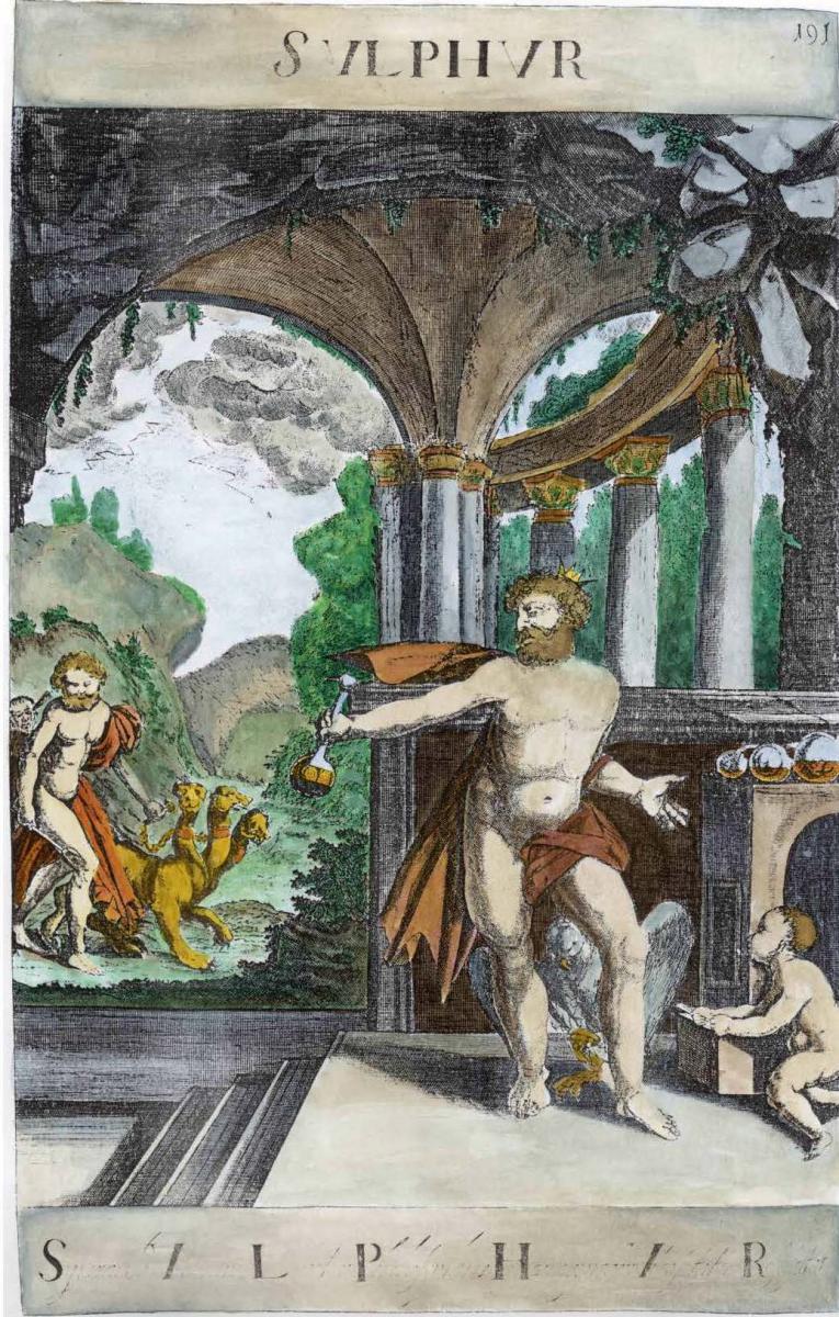 10. SULPHUR. Акроним: «Отделяя яд, философ осторожно возрождает однородную вязкость». Из масла, полученного в результате разложения Материи, рождается Сера, принцип Закрепления. Однако присутствие Плутона (на заднем плане) намекает, что герою придётся ещё раз пересечь Стикс, прежде чем он получит Философский камень.