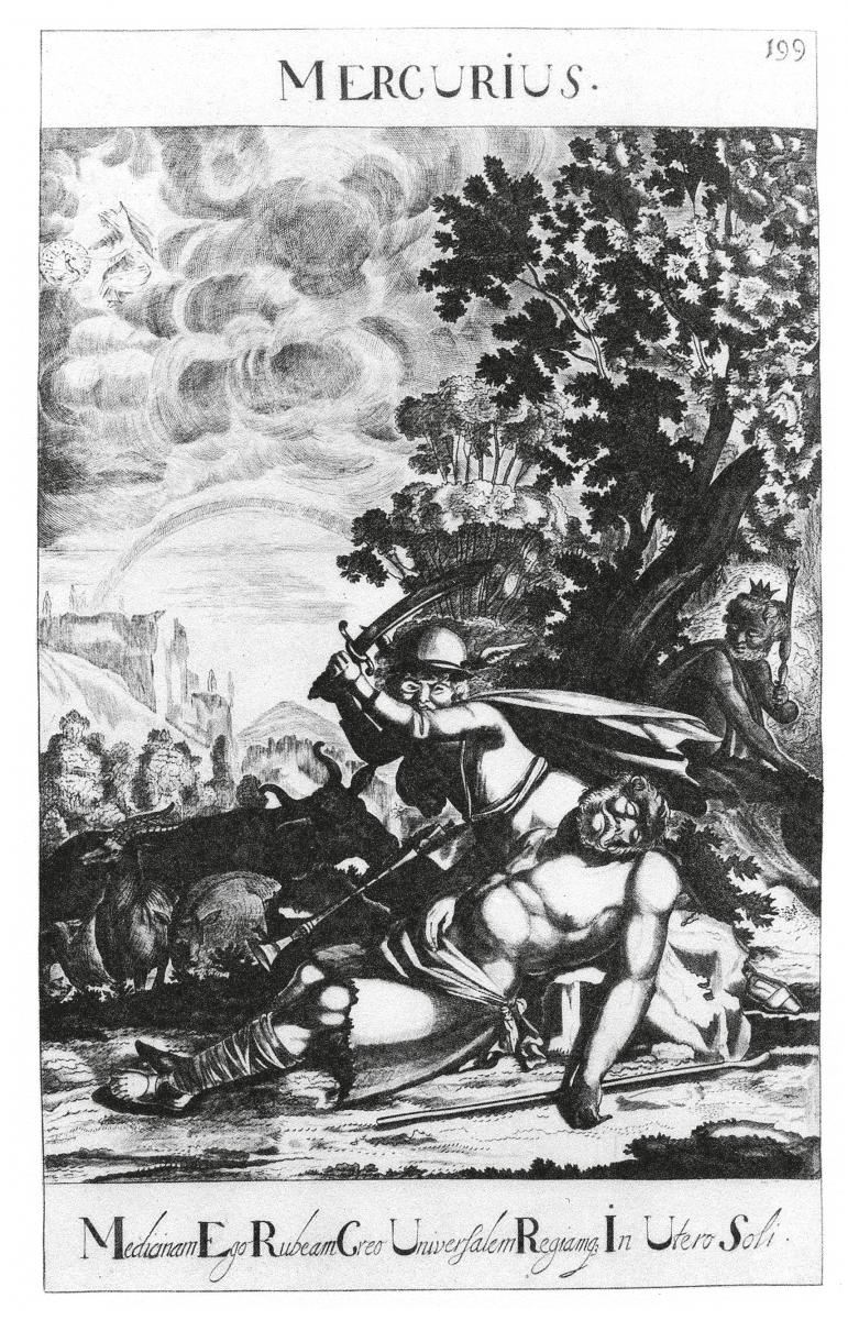 11. MERCURIUS. Акроним: «В лоне я создаю универсальное королевское Красное лекарство для Солнца». Сюжет этой эмблемы — убийство Аргуса Меркурием по приказу Юпитера. Юнона превратила в корову прекрасную Ио, очередной объект страсти Юпитера, и поставила многоглазого Аргуса охранять её. Меркурий, следуя приказу Юпитера, начал играть на флейте и в итоге усыпил великана; тогда Меркурий убил его и украл Ио. Знание алхимии (которую называют также искусством Музыки) позволяет Летучему (Меркурию) растворить (убить) Закреплённое (Аргуса). Смерть последнего символизирует наступление Черноты; но затем его бесчисленные глаза появляются на Хвосте Павлина (птицы Юноны) — наступает следующая стадия Работы. Белая корова Ио означает Белизну, первое Совершенство.