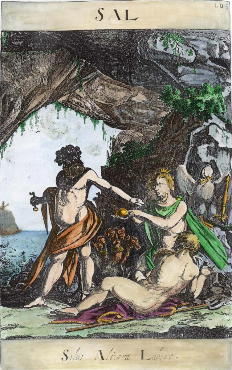 12. SAL. Акроним: «В одиночестве я создаю высшие вещи». Проблему получения Соли, катализатора и посредника Великой Работы, решить не так-то просто. Однако Юпитер показывает нам один из компонентов этого двойного вещества, а Нептун держит другой; Плутон, протянувший одну руку к этим компонентам, а в другой сжимающий ключ, указывает, что знание этого вещества необходимо для ключевой операции Гниения, которая открывает двери в подземное царство мертвых.