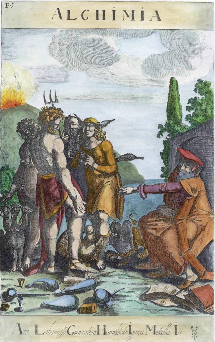 2. ALCHIMIA. Акроним: «Многотрудное искусство обращения огненной влажности металлов в Меркурий (ртуть)». Адепт указывает на Меркурия, беседующего с Юпитером, Плутоном и Нептуном. Эта четвёрка воплощает основные философские Элементы: Нептун, Вода; Плутон, Земля (минеральные руды); Юпитер, Воздух (и Небесный Огонь); Меркурий, Квинтэссенция, крылатый посланник, способный принять форму любого из четырёх элементов.