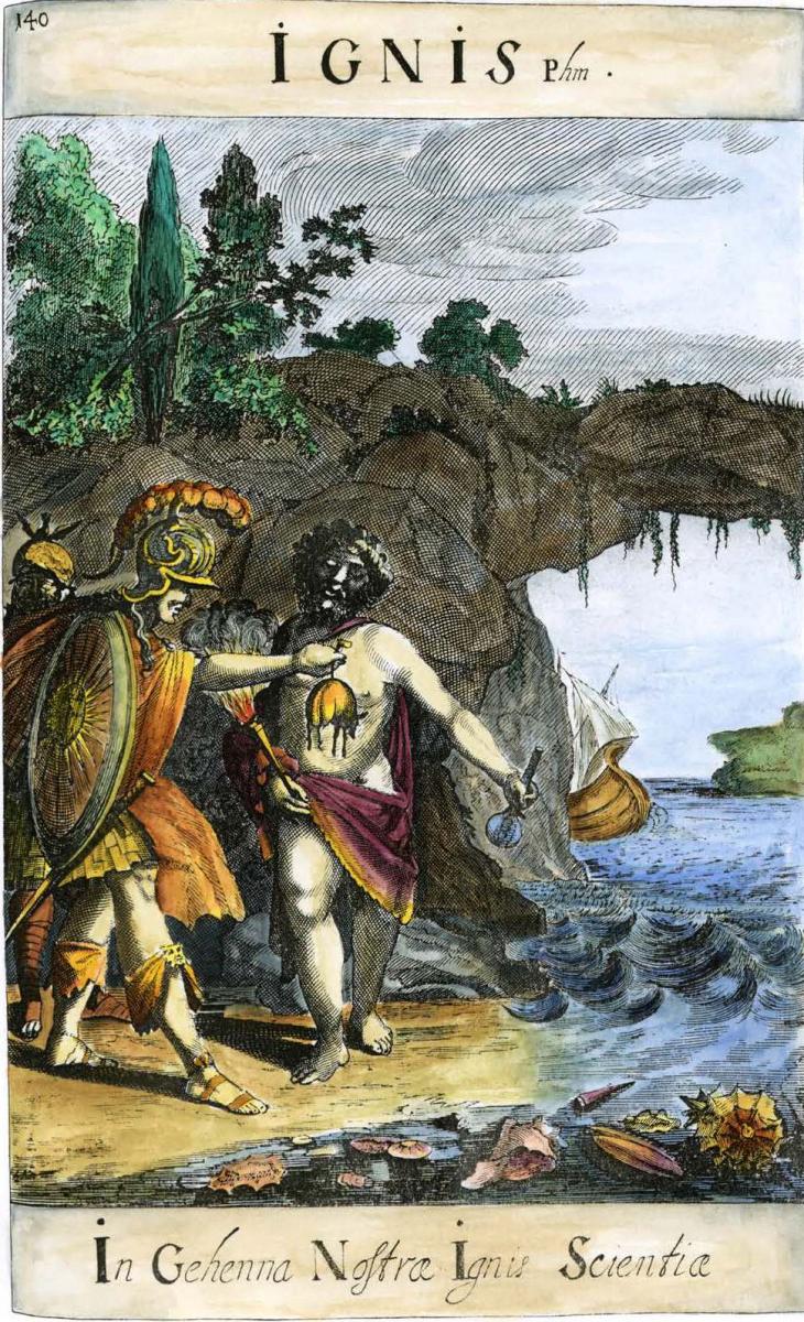 6. IGNIS PHILOSOPHORUM. Акроним: «В Геенне огонь нашей науки». Ignis Philosophorum, огонь философов, нужно искать в Геенне, то есть фактически на свалке (в этой долине возле Иерусалима сжигали мусор и трупы животных). Знание этой «великой тайны Искусства» оказалось крайне полезным для Ясона в его путешествии за Золотым Руном. Лиможон де Сен-Дидье, отказываясь открыть сам секрет, всё же даёт нам некоторые ценные подсказки: «Тайный огонь мудрецов — это Огонь, приготовленный Мастером по правилам Искусства или же подготовленный для него другим знатоком алхимии; этот огонь не обжигает: это огненный дух, который следует ввести внутрь Предмета той же природы, что и Камень. Этот Предмет, нагретый внешним огнём, кальцинирует огненный дух, затем растворяет, сублимирует и снова растворяет его в сухой воде, согласно словам Космополита» («Le Triomphe Hermetique»).