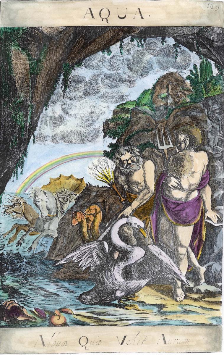 8. AQUA. Акроним: «Приносящая белое золото». Вода Философов — это их Ртуть. Из Тьмы между Плутоном и Нептуном выступает Юпитер в образе Лебедя, то есть Белизна, полученная после омовения Латоны ее Водой. Белизна возвещает восход Солнца, чьи кони уже видны на заднем плане.