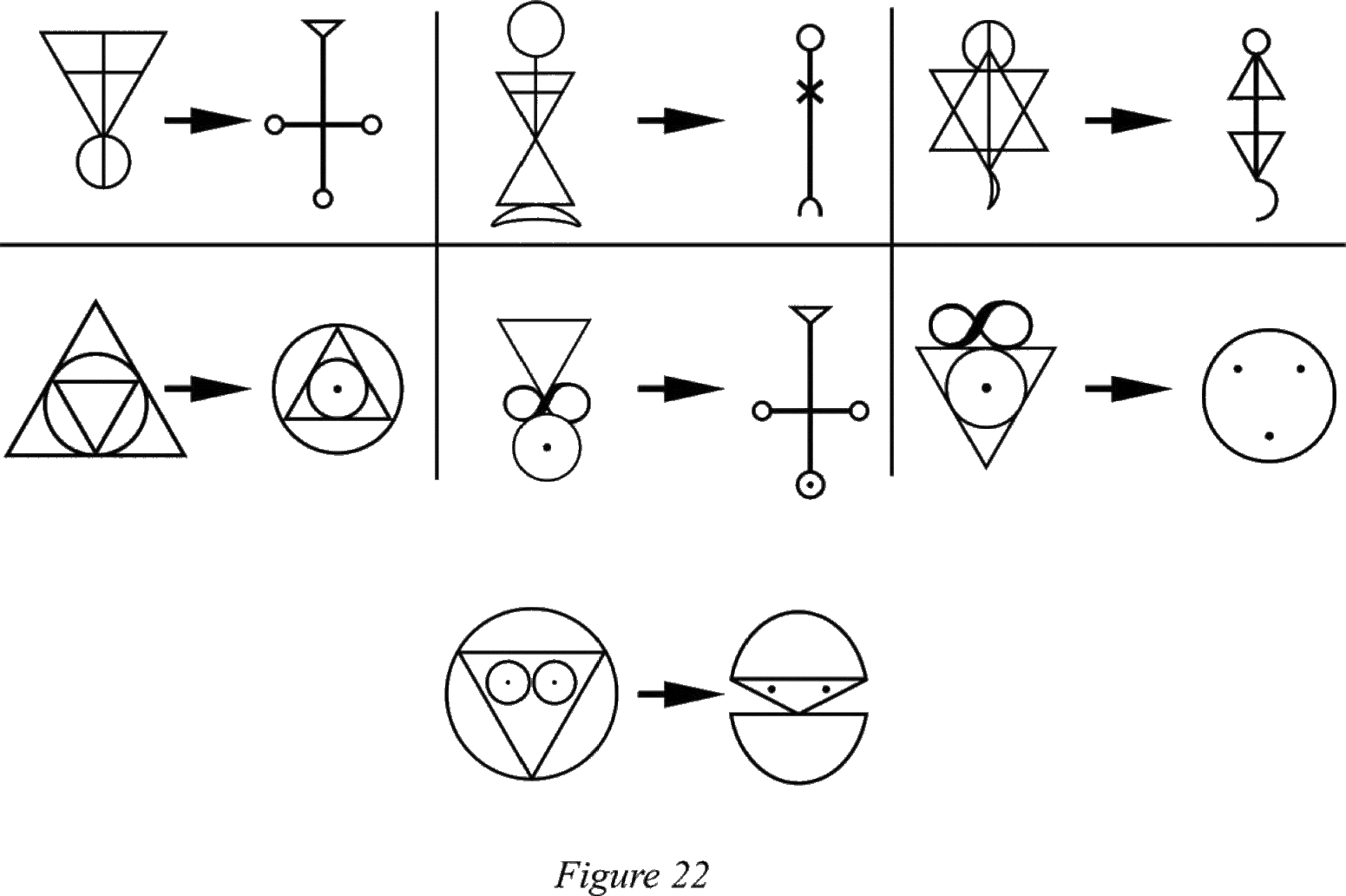 Можно возразить, что этот метод противоречит основе системы Спейра, потому что она не работает с индивидуальными сигилами. Однако это лишь частично верно. Ведь субъективные элементы, составляющие такие сигилы могут состоять из общепризнанных символов, но конечный результат, безусловно, будет индивидуальный. К тому же обычно происходит отбор основных символов, а также процессы упрощения / стилизации и украшения. Печати из наших последних примеров могут быть объединены в виде рисунка 22.