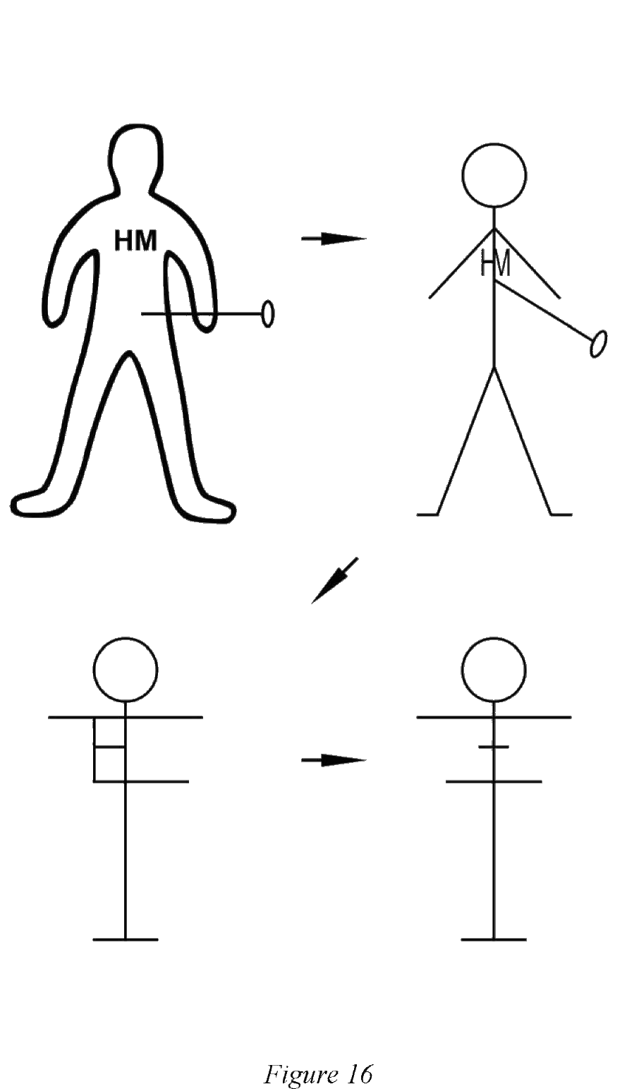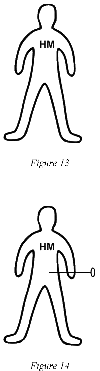 Представьте, что вы хотите исцелить друга. Допустим, его зовут Хэнк Миллер (Hank Miller), и он страдает от болей в животе. Как в магии кукол вуду, вы можете нарисовать фигурку с его инициалами (см. рисунок 13). Затем вы вводите «астральную иглу для иглоукалывания» в его живот, с целью исцелить восстанавливающей энергией пораженную часть тела (рис. 14):