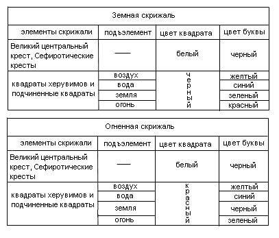 Буквы окрашенных квадратов, однако, окрашены в цвет, соответствующий элементу квадранта. То есть в водном квадранте Воздушной скрижали, квадраты окрашиваются в желтый цвет, а буквы – в голубой. В квадранте Огня Земли – квадраты черные с красными буквами. В квадранте, соответствующем элементу скрижали, цвет буквы находится в «приветственном» или «вспыхивающем» цвете по отношению к цвету элемента. Так, Воздух Воздуха – желтый квадрат с фиолетовой буквой. Так как черный цвет не имеет никакого «приветственного» цвета, то в квадранте Земли буква имеет зеленый цвет на черном фоне.