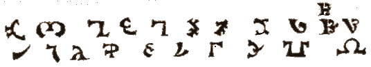 Сначала появился алфавит нового языка: 21 особая буква, каждая с собственным названием. Названия букв были необычны, и, кажется, не соответствовали фонетически самим буквам; фактически, эти названия были даны тремя группами по семь, что в сумме дает 64 буквы, которые можно сгруппировать как квадрат 8 на 8 или 7 на 9 или 21 на 3.