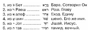 «Мы возьмем первое из Библии речение к раздроблению: в подлиннике Еврейском начинает Гл.1. ст.1 1-е речение: tywarb Берешид: сие речение состоит из 6 букв. Нотарикон поставляя по порядку одну букву за другою, составляет из одного речения шесть следующих речений, как то: