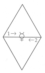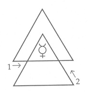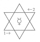 10. Начертите желтую Изгоняющую Гексаграмму Меркурия (соответствующую Северу) и фиолетовую букву «Тау» в центре, вибрируя при этом А-РА-РИ-ТА. Начертите желто-оранжевый глиф Меркурия в центре, вибрируя при этом Э-ло-хем Цев-а-от. Спроецируйте желтый Свет сквозь гексаграмму, используя Знак Входящего. Сделайте Знак Молчания.