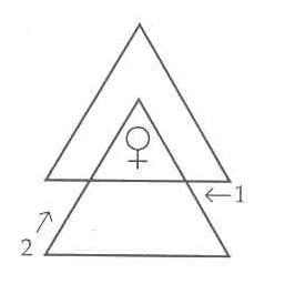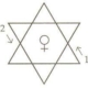 10. Держите лотосовый жезл должным образом – за соответствующую цветную часть (то есть, за зеленую (Весы) – днем, оранжево-красную (Телец) – ночью, или за ту часть, которая соответствует Сидерическому Зодиакальному Знаку, где находится в данный момент Венера), начертите зеленую Вызывающую Гексаграмму Венеры (соответствующую Востоку) и красную букву «Йод» в центре, вибрируя при этом А-РА-РИ-ТА. Начертите красный глиф Венеры в центре, вибрируя при этом Йод-Хе-Вау-Хе Тцаб-а-от. Спроецируйте зеленый Свет сквозь гексаграмму, используя Знак Входящего.