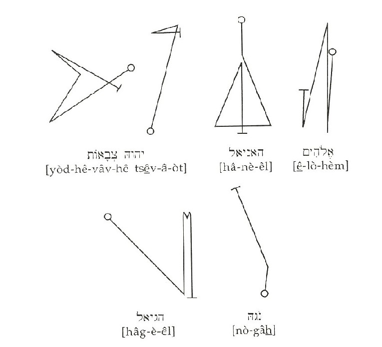31. Каждое из Имен в следующей инвокации необходимо вибрировать дважды. Сперва вибрируйте Имя, одновременно чертя его на иврите (над гексаграммой, справа налево). Потом снова вибрируйте Имя, одновременно рисуя его Сигилу, как указано. Произнесите:
