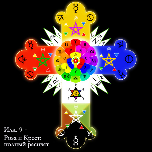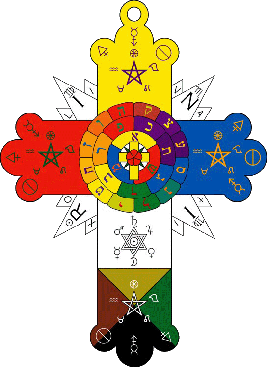 Вокруг гексаграммы, изображенной на белой части эмблемы, под Розой, помещаются символы планет. Порядок их расположения — ключ к Высшему ритуалу гексаграммы. Вокруг пентаграмм, изображенных на каждом из четырех рукавов Креста, начертаны символы Духа и четырех стихий. Порядок их расположения — ключ к Высшему ритуалу пентаграммы. На каждом конце Креста, разделяющемся на три лепестка, изображены символы трех алхимических первоначал — в различном порядке, в зависимости от того, какой стихии соответствует данный рукав Креста: так эти символы отображают действие трех первоначал в сфере каждой данной стихии.