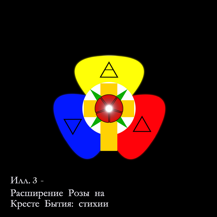 Три материнские буквы соответствуют стихиям. Но располагаются они особым образом. Только лепесток Воздуха находится под рукавом Креста, связанным с Воздухом. Лепестки же Огня и Воды меняются местами: лепесток Огня помещается на рукаве Воды, и наоборот. Это необходимо для того, чтобы стихийные силы рукавов Креста не подавляли силы планет и знаков зодиака, что могло бы случиться, если бы лепесток Огня располагался на рукаве Огня, а лепесток Воды — на рукаве Воды. Подчиниться же власти планет необходимо, дабы обрести Славу Солнца.