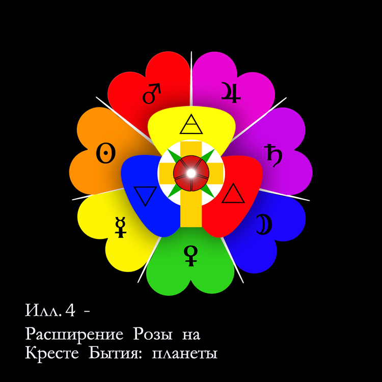 Семь двойных букв, расположенные на среднем кольце лепестков, соотносятся с планетами в порядке следования знаков их экзальтации, ибо планеты — странницы, а звезды относительно Земли неподвижны.