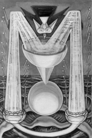 •Описание в системе Золотой Зари: В нижней части карты из облаков протянута рука, держащая на ладони чашу Приуготовителя1, из которой бьют мощные струи воды. Брызги от этих струй образуют еврейскую букву Хе. Струи ниспадает вниз, питая спокойное море, на поверхности которого цветут кувшинки и лотосы.