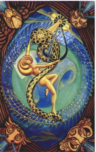 На протяжении многих лет карта Вселенной украшала обложку переизданий «Книги Тота», выпускавшихся компанией «Weiser». Так что теперь это одна из самых известных карт Таро Тота. Но, при всей своей привычности, она остается одной из самых сложных и таинственных карт колоды. В ней есть несколько деталей, значения которых я вообще не понимаю. Например, что это за черный предмет в правой руке богини, похожий на полумесяц? Понятия не имею. И никаких указаний на этот счет в «Книге Тота» я не нашел. Если же необходимые пояснения содержатся в какой-либо другой книге Кроули, то, каюсь, я это место пропустил. Я могу лишь предполагать, что это серп — атрибут, вполне уместный в руках сатурнианской богини. Создается впечатление, что острие этого серпа она вонзает прямо в центр большого глаза, изображенного в верхней части карты, и, возможно, таким образом исторгает из него сияющие лучи, — но полной уверенности в этом у меня нет.