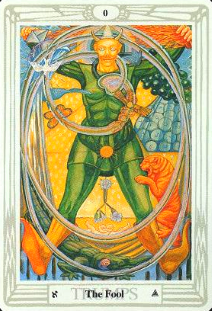Дурак Таро Тота сохраняет многие элементы, знакомые нам по традиционным колодам, но при этом откровенно демонстрирует, что персонаж, с которым мы имеем дело, — не кто иной, как непостижимое верховное божество всех эпох и культур. Он — языческий Зеленый Человек, олицетворение весны; он — Парсифаль, простодушный глупец, добывающий Святой Грааль; он — Гарпократ, невинный младенец, египетский бог молчания; попирающий бога-крокодила Себека, Пожирателя. Его «дикие» глаза и рога, а также присутствующие на карте тигр, сосновые шишки, виноград и плющ выдают в нем ту сокровенную сущность космоса, которой веками поклонялись под именем Диониса. Это Дионис Загрей — рогатый сын Зевса; это Вакх Дифий — пьяный и безумный пансексуальный бог божественного экстаза.