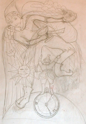 Дурак, изображенный Фридой Харрис, — настоящий кладезь священных образов, многие из которых удается обнаружить лишь посредством долгой медитации (и при помощи увеличительного стекла). Он врывается в мир из-за покрова трех спиральных колец, которые исходят из его сердца и в него же возвращаются. Это три завесы небытия (Айн, Айн Соф и Айн Соф Аур6), которые, по учению каббалы, дали начало творению. В котомке Безумца заключена вся вселенная, представленная в образе монет с планетарными и зодиакальными символами.