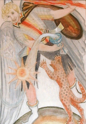 Дурак — не кто иной, как сам Дух Святой. Из чаши Грааля в его правой руке вылетают голубь — символ Святого Духа; бабочка — символ трансформации; крылатый шар — символ вечно движущегося воздуха; и египетская богиня-коршун Маут (Мут)7. Подобно Деве Марии, Маут зачала от духа (дыхания) ветра. «Вся картина в целом — символ Творческого Света»8, — заключает Кроули.