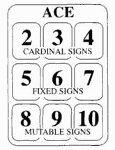 Двойки, Тройки и Четверки, составляющие первую группу из трех числовых карт каждой масти, соотносятся с кардинальными знаками. Пятерки, Шестерки и Семерки – вторая группа – с фиксированными. Восьмерки, Девятки и Десятки – третья группа – с мутабельными. (См. нижние строки таблицы 2.)