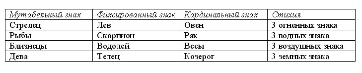Двенадцать знаков зодиака классифицируются сперва по стихиям (огненные, водные, воздушные и земные), а затем, в рамках каждой стихии, – по трем качествам: кардинальному (зарождение свойств данной стихии), фиксированному (зрелое и вполне определенное проявление свойств стихии) и мутабельному (упадок свойств и готовность перейти к следующей стихии).