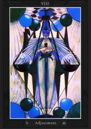 Когда я проходила мимо Парка им. Горького, мне пришла простая, даже немного поэтичная мысль: «Осень – это время, когда природа умирает, и, по логике вещей, это должно выглядеть несколько трагично. Но почему тогда повсюду в воздухе витает необъяснимое умиротворение, будто природа и не задумывается о приближении холодов, о неминуемой её «смерти»? Поток времени словно остановился: для неё существовал только настоящий момент, «здесь и сейчас». Тут же у меня возникла любопытная ассоциация с этой мыслью: женщина лет 55-60, мудрая наставница, что пока не совсем стара, но и не молода. Для неё не актуальны ни прожитое, ни будущее, только настоящее, в ней нет страха смерти, да и вообще страха, она полна осознанности. Этот образ был столь уравновешенным, что, несомненно, напомнило о нынешнем положении Солнца в Весах и, безусловно, о «Регулировании». Следом, перед глазами всплыл образ самой карты, и тут меня осенило: «Ну, конечно же, осознанность! Вот в чём таится отправная точка идеи VIII Аркана!» Далее, весь день был ознаменован чередой открытий.