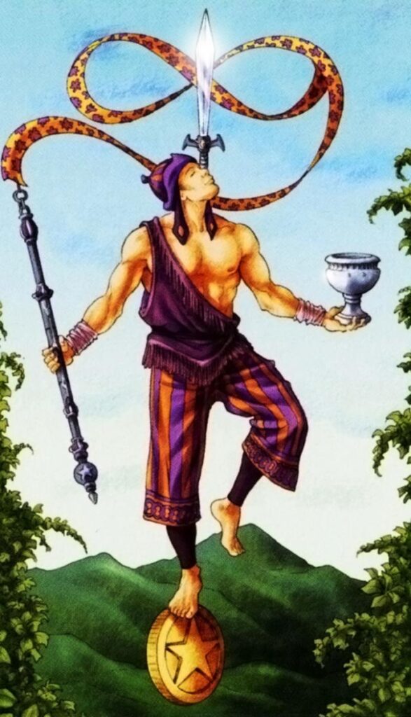 4 Традиционные орудия Мага — Жезл (воля, мудрость, слово), Чаша (понимание), Кинжал или Меч (разум) и Пантакль или Диск (тело).