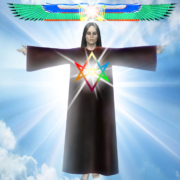 - И даже если он уже поднялся выше ступени Послушника, пусть носит мантию Послушника, ибо пламенеющая звезда на груди явно означает Ра-Хор-Хута, тайно же — Нуит в образе синего треугольника, обращенного вниз, и Хадит — в образе красного треугольника. Я же — золотая Тав в сердцевине их соития. Но, если пожелает, может вместо этой мантии носить плотно облегающее одеяние из переливчатого шелка, пурпурного с зеленым, а поверх него — плащ без рукавов, ярко-синий с золотыми блестками и алой подкладкой.