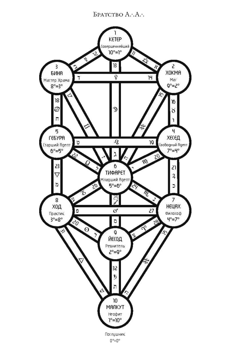 На предыдущей странице изображена схема степеней Братства А.·.А.·. Форма этой схемы — каббалистический чертеж, именуемый Древом Жизни.