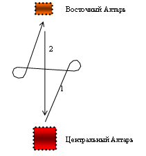 Жрица решительно поворачивается лицом к Восточному Алтарю, и проходит к нему зигзагом молнии, танцуя обороты в ее углах; вот так (1):