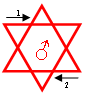 Хамаль, не поворачиваясь, на Алтарь16, чертит (Орудием или рукой) Призывающую Гексаграмму Марса, а в центре её – Знак ♂, при этом вибрирует אלהים גבור. Потом командует: