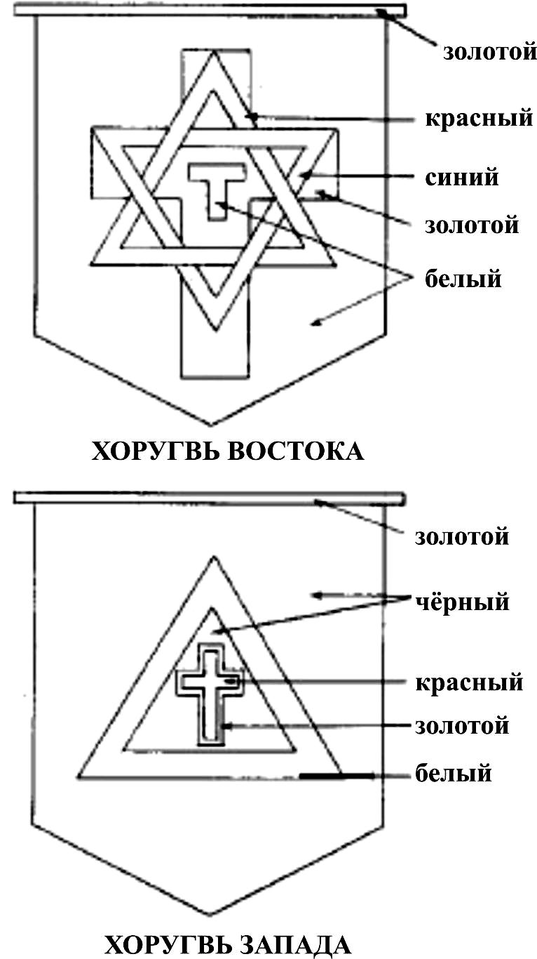 В документах Золотой Зари утверждается определённо только то, что подставка для хоругви Востока должна быть белой, а для хоругви Запада — чёрной. Очень просто изготовить подставку из круглой или квадратной деревянной стойки, установленной на опорную плиту. Подставки с витыми колоннами, показанные здесь на иллюстрации, можно сделать из декоративных деревянных стержней, используемых как карнизы. Наконечники, пригодные для того, чтобы надеть их на концевые части стоек, сделанные из фанерных кружков, продаются уже готовыми во многих магазинах деревянных изделий. Шнур, при помощи которого подвешиваются хоругви, прикрепляется концами к выдвижным вкладкам.