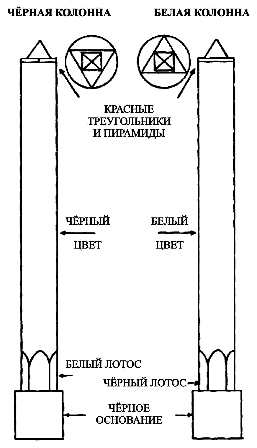 Одна из них белая, а другая — чёрная. Обе увенчаны красными треугольниками и пирамидами, освещаемыми светом из сокрытого источника. На Чёрной Колонне нарисованы белые египетские фигуры и белый лотос, в её основании — чёрный куб. На Белой Колонне нарисованы чёрные египетские фигуры и чёрный лотос, она также установлена на чёрном кубе.