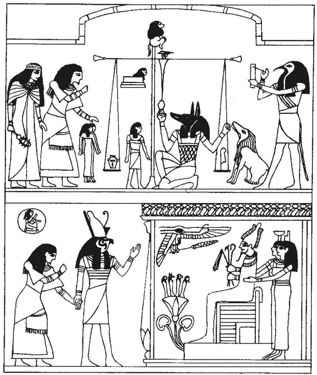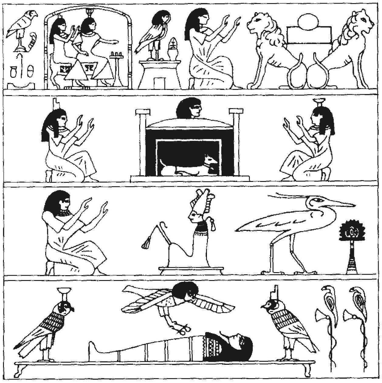 Это — рисунок из семнадцатой главы Книги Мёртвых, представляющий собой иллюстрации, сопровождающие «Гимн Восходящему Солнцу», слегка изменённый Орденом для использования на колоннах. Иллюстрации, приведённые здесь, в точности скопированы из документа, написанного Броуди-Иннесом и озаглавленного как Дополнительная Лекция Степени Неофита 0○ = 0□ № 2А, Приложение к Лекции о Колоннах (Carr P. Collins, Jr. Collection, the Bridwell Library, S.M.U., Dallas, Texas). Упомянутая лекции была кратко изложена Мазерсом, который вместе с Броуди-Иннесом основал Орден «Альфа и Омега» после распада Храма Золотой Зари Исиды-Урании в 1900 году.