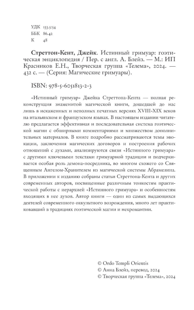 «Истинный гримуар» Джейка Стреттона-Кента — полная реконструкция знаменитой магической книги, дошедшей до нас лишь в искаженных и неполных печатных версиях XVIII-XIX веков на итальянском и французском языках. В настоящем издании читателю предлагается эффективная и последовательная система гоэтической магии с обширными комментариями и множеством дополнительных материалов. В книге подробно рассматриваются темы эвокации, заключения магических договоров и построения рабочих отношений с духами, анализируются связи «Истинного гримуара» с другими ключевыми текстами гримуарной традиции и подчеркивается особая роль демона-посредника, во многом схожего со Священным Ангелом-Хранителем из магической системы Абрамелина. В приложении к изданию собраны статьи Стреттона-Кента и других современных авторов, посвященные различным тонкостям практической работы с иерархией «Истинного гримуара» и особенностям входящих в нее духов. Автор книги — один из самых выдающихся деятелей современного оккультного возрождения, много лет практиковавший в традициях гоэтической магии и некромантии.