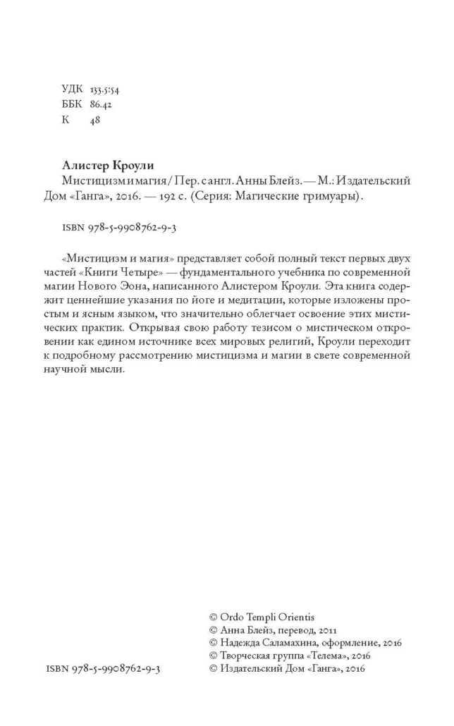 Вниманию читателя предлагается первые две части труда знаменитого мага и мистика конца XIX — первой половины XX века Алистера Кроули, так называемой Книги Четыре. Непосредственно автор охарактеризовал её как «трактат по магии и мистицизму для начинающих».