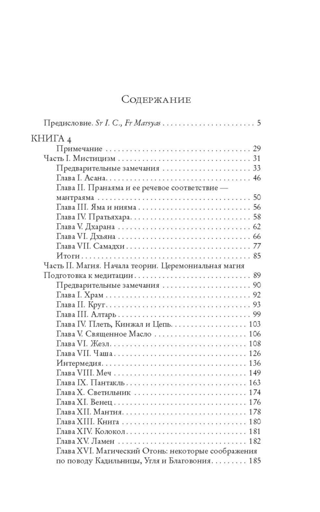 — поясняется во введении. В предлагаемой работе рассматриваются базовые понятия мистического и духовного пути, такие как медитация, асана, пранаяма, яма и нияма, пратьяхара, дхарана, дхьяна и, конечно, самадхи. Также излагается начало теории и базовая символика церемониальной магии, как и следовало полагать, основанная на учении четырех стихий. Подробно разбираются Храм и элементы убранства Храма, их глубинный смысл: Круг, Алтарь, Плеть, Кинжал, Цепь, Жезл, Чаша, Меч, Пантакль и так далее. Во введении уточняется:
