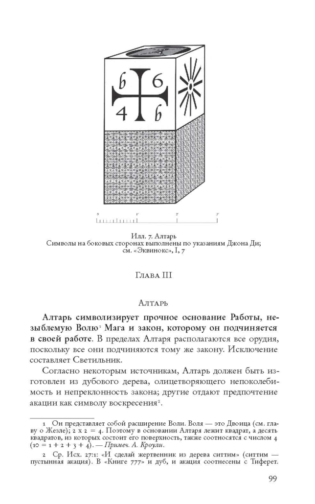 Ответ. Кроули был, по всей видимости, перфекционистом, оптимистом, да еще английским снобом, исходя из чего предложил самый лучший вариант того, как бы это могло выглядеть. Разумеется, далеко не всем доступно то, что было доступно автору, в том числе и в материальном отношении. На самом деле, орудия и атрибуты скорее не изготовляются, а «обретаются», это сложный процесс и еще сложнее изложить его вербально с позиций формальной логики. Как утверждает сам автор, и что подтверждается опытом многих поколений магов, только ищущий берется за создание Храма и орудий, как тут же оказывается, что он не может найти и приобрести самые обыденные вещи, которые ранее мог купить в соседнем киоске. Посему, всё, разумеется, индивидуально и тем не менее на некоторые общие законы, принципы и традиции ориентироваться необходимо, а главное, приложить все возможные усилия, дабы получить лучшее, что возможно в данных условиях.