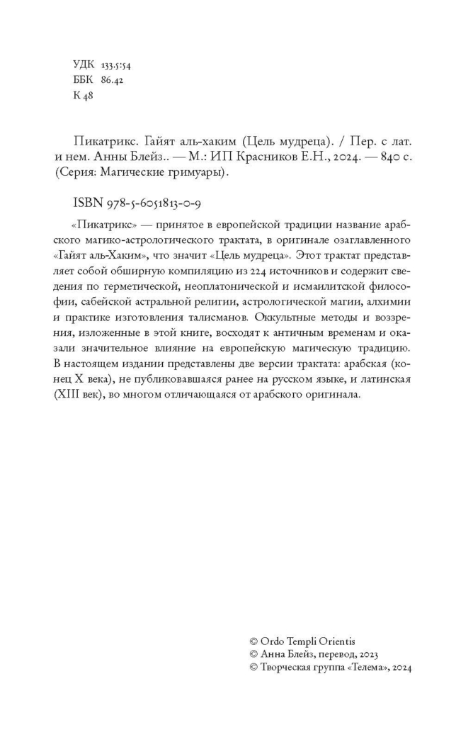 В настоящем издании представлены две версии трактата: арабская (конец X века), не публиковавшаяся ранее на русском языке, и латинская (XIII век), во многом отличающаяся от арабского оригинала.