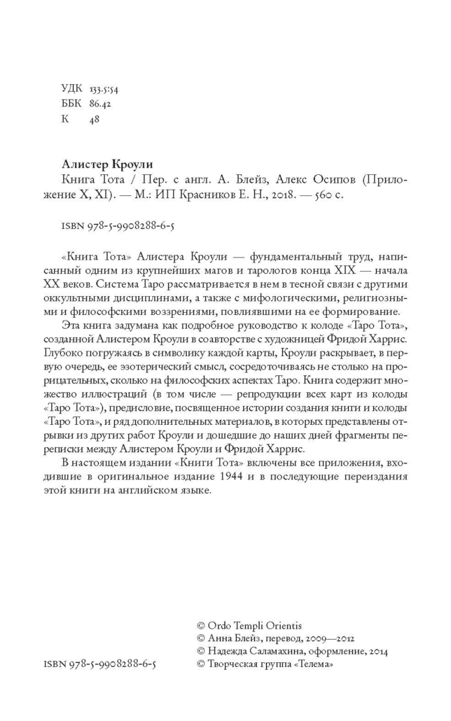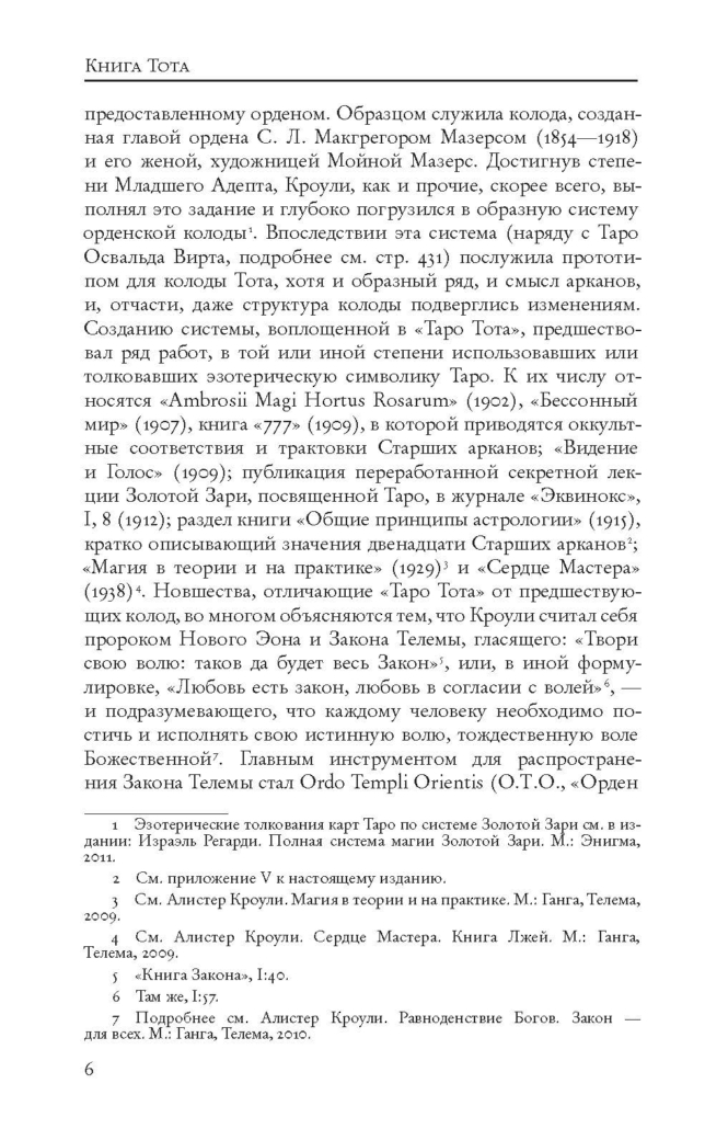 Это интереснейший труд, где Кроули рассматривает Таро как неотъемлемую часть всей западной магической традиции и раскрывает связь Таро с другими магическими дисциплинами. Книгу Тота стоит купить и прочитать и тем, кто пока не использует в работе Таро Тота, и тем более тем, кто уже имеет опыт работы с этой колодой.