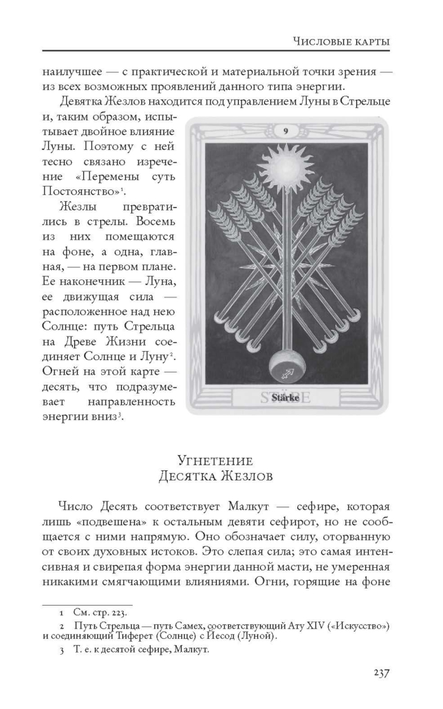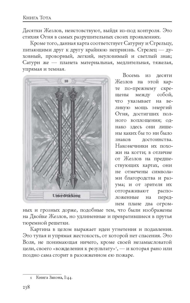 Да, это совсем не «белая книжечка»-подсказка, прилагаемая к каждой колоде, и читать ее по началу может быть сложно. Но по мере прочтения и одновременного изучения колоды она позволяет действительно глубоко погрузиться в символизм Таро Тота. Однозначно рекомендую.